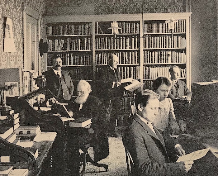[In the Abbott company library, from left to right: W. C. Abbott, Dr. Ephraim Epstein, Dr. William Waugh, Dr. Henry Candler and his secretary, and Dr. Alfred Burdick, c. 1900]