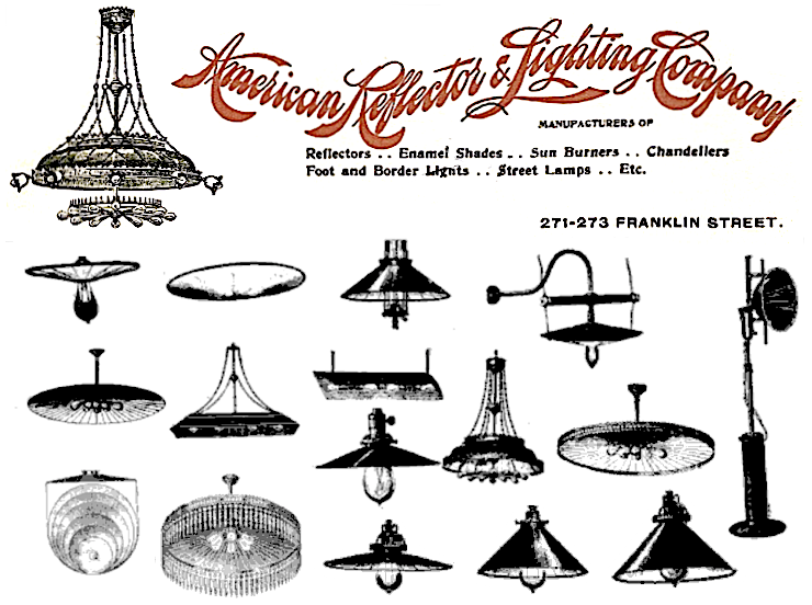 “Treasurer Charles Landis of the American Reflector & Lighting Company of 271-273 Franklin Street, Chicago, reports a factory full of orders,” the Western Electrician magazine reported in 1897. “The American Reflector company manufactures over 150 styles of reflectors for electricity, gas and oil. . . . It makes reflectors for lighting art galleries, window reflectors, orchestra shades, incandescent street electric light hoods, stage dimmers, incandescent calcium light theatrical lamps, reflector chandeliers, hall & vestibule lamps, silver-plated mirror reflectors—in fact, it is safe to say anyone desirous of purchasing anything in the line of reflectors can find goods to suit him in the Chicago salesroom of the American company.”