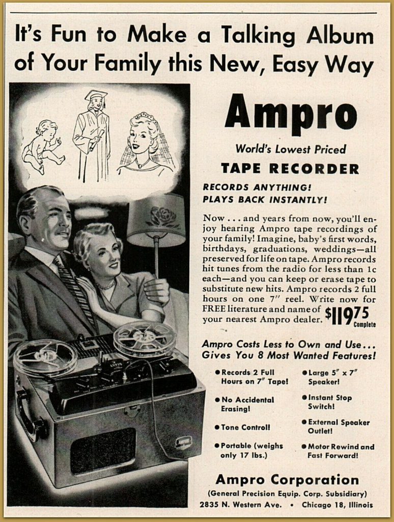 “Now . . . and years from now, you’ll enjoy hearing Ampro tape recordings of your family!” one ad read. “Imagine, baby’s first words, birthdays, graduations, weddings—all preserved for life on tape. . . . 2 full hours on one 7” reel.”