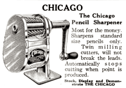 I just cleaned up my Chicago No. 2 pencil sharpener, which was sold through a New York stationer called the Kanter Press on E. 23rd St. It apparently still exists, at a slightly different address (to be verified). It looks amazing. I found it in a closet in an apartment I bought in 1981, and took it with me when I sold my share. When I finally cleaned off all the old paint and tarnish, I was amazed to see the “Automatic Pencil Sharpener Division” logo, as well as “to take off, turn.”