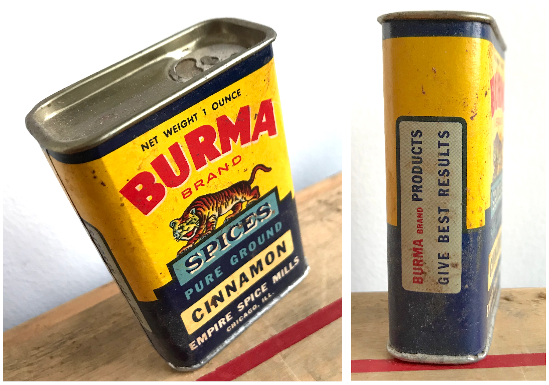 Museum Artifact: Burma Brand Spices: Pure Ground Cinnamon Tin, c. 1940s