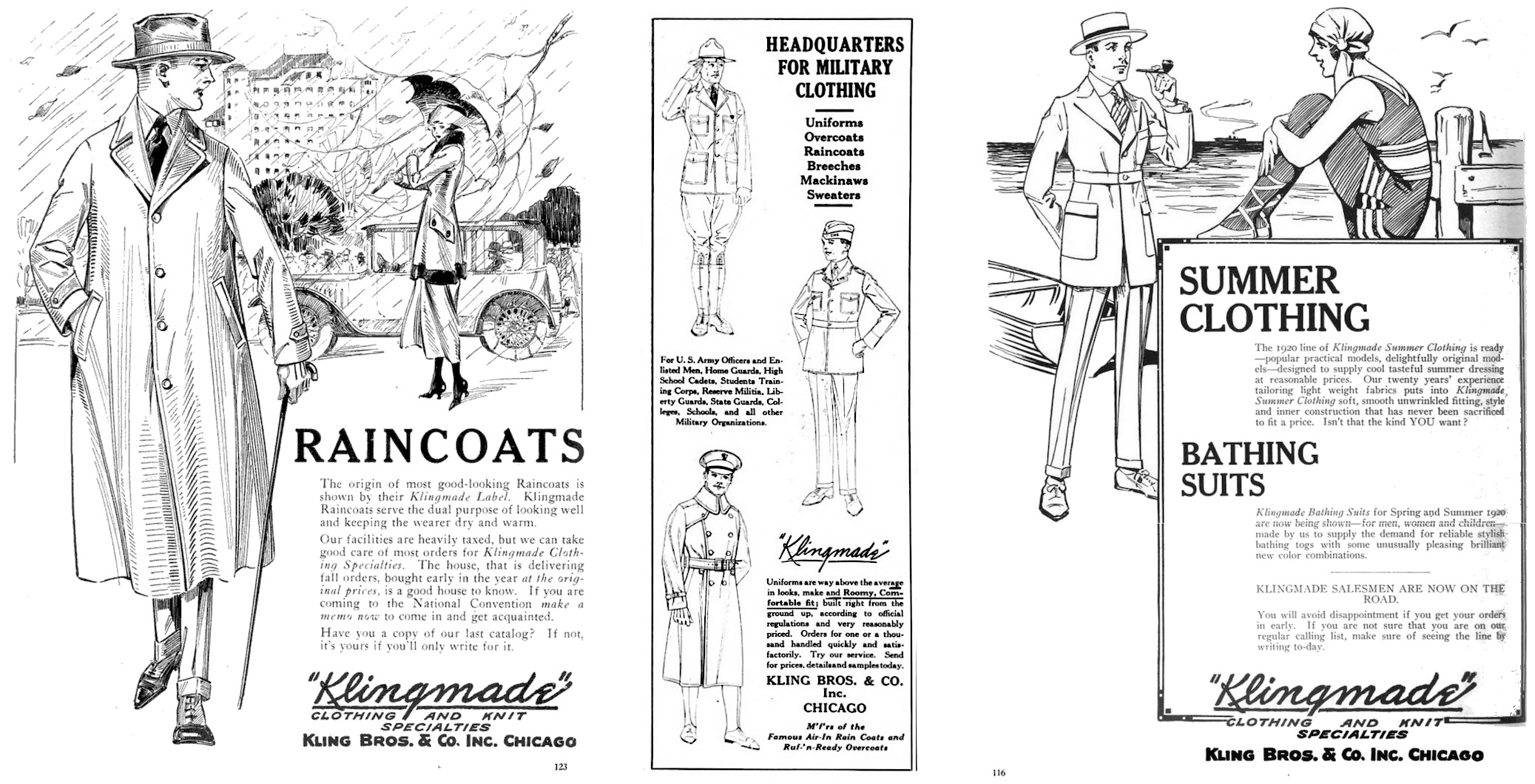 During the labor clashes and the horrific world war going on concurrently, Kling Bros. had still managed to expand not only its sales territory, but its range of products. They promoted themselves as the “headquarters for military clothing” during World War I (although it’s unclear if they actually had government contracts to clothe the enlisted men overseas), and made a wide range of uniforms with a “roomy, comfortable fit.” Meanwhile, for the everyday working man, the Kling “Air-In Raincoat” and “Ruf’-n-Ready Overcoat” handled the rough weather, while the “Airy-Lite” line of suits kept things breezy in the summer.