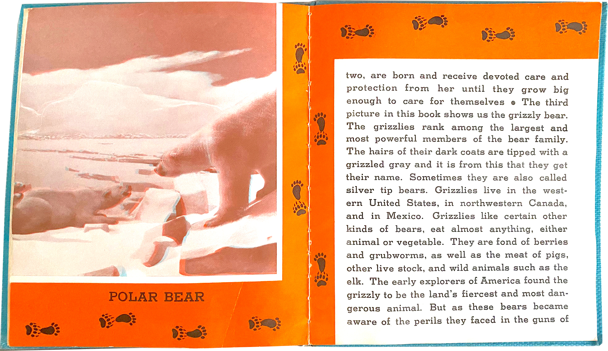 Published in 1934 by an upstart Chicago firm known as the Orthovis Company, The Bear was but one volume in “The Foot Print Series”—a collection of 3-D wildlife books developed in conjunction with the Field Museum over a 2-3 year period. Other titles included The Lion, The Deer, Wild Sheep & Goats, Giants of the Animal Kingdom, Strange Animals, Monkeys & Apes, and Wild Oxen. If you had the whole set, it goes without saying that you were the coolest kid in school . . . and maybe the only one with a stable economic home life.