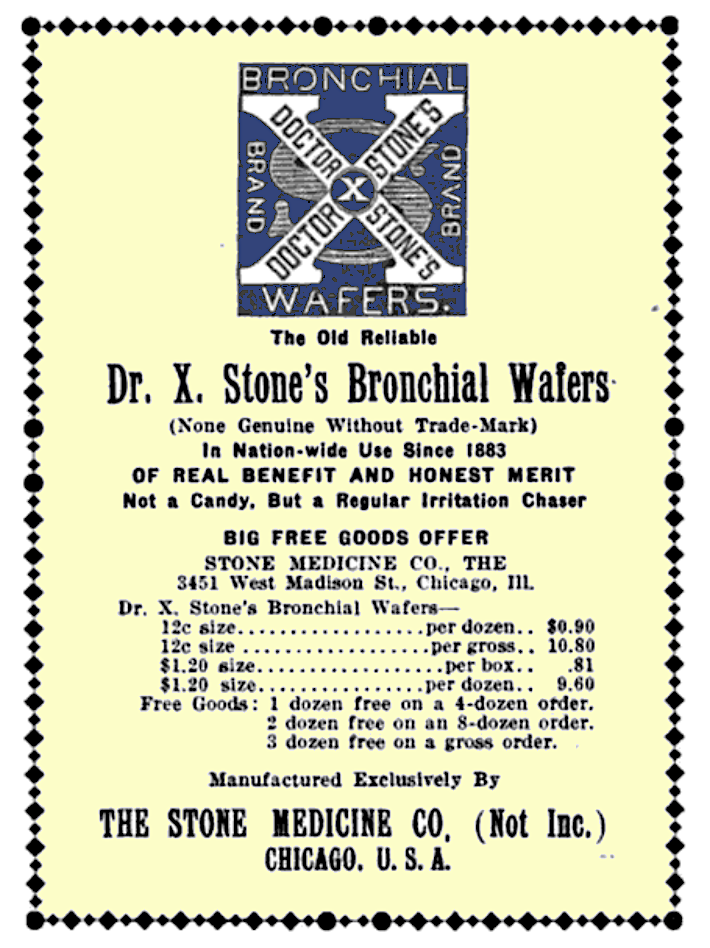 The very same year he incorporated his magic scale company, Will Rood—through a series of events we will never know (tragically!)—started promoting a new product from his same Quincy, Illinois offices. It was, of course, Dr. X. Stone’s Bronchial Wafers—manufactured by a mysterious new firm called the Stone Medicine Company.