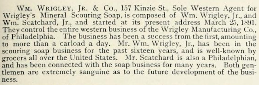 [Excerpt from the 1891 book Chicago and Its Resources 20 Years After, discussing the upstart Wrigley business before chewing gum was even involved]